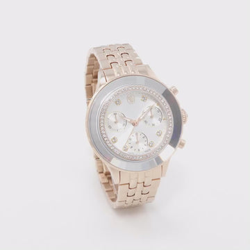 This dazzling chronograph watch delivers a perfect fusion of watchmaking expertise and Swarovski savoir-faire. The 37mm case is made with a champagne gold-tone finish and features a crystallized bezel, which is neatly faceted and accompanied by a circle of clear pavé. Beneath the mineral glass, the white sunray dial features a swan logo at 12 o’clock, fluorescent hands, and three chronograph counters for separate measurements of hours, minutes, and seconds. There are also six clear crystals used for the indexes and a single crystal placed in the watch’s crown. Worn on an adjustable metal bracelet, this Swiss made watch is water resistant to 50m.