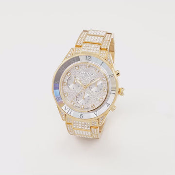 A dazzling ode to Swarovski savoir-faire, this iced-out Dextera timepiece radiates brilliance every hour. The 40mm stainless steel case is gold-tone finished and is mounted with a facetted bezel, cut to reflect the light. Most strikingly, the chronograph dial is embellished with around 240 round cut crystals and three subdials including a minutes counter, seconds counter, and hours counter. For maximum shine, there are index markers indicated with individual crystals as well as fluorescent hands. The case itself is encrusted with 16 crystals, with a single crystal set in the crown, while around 492 crystals adorn the stainless steel bracelet. This Swiss made watch is water resistant to 50 meters and exudes joyful extravagance.