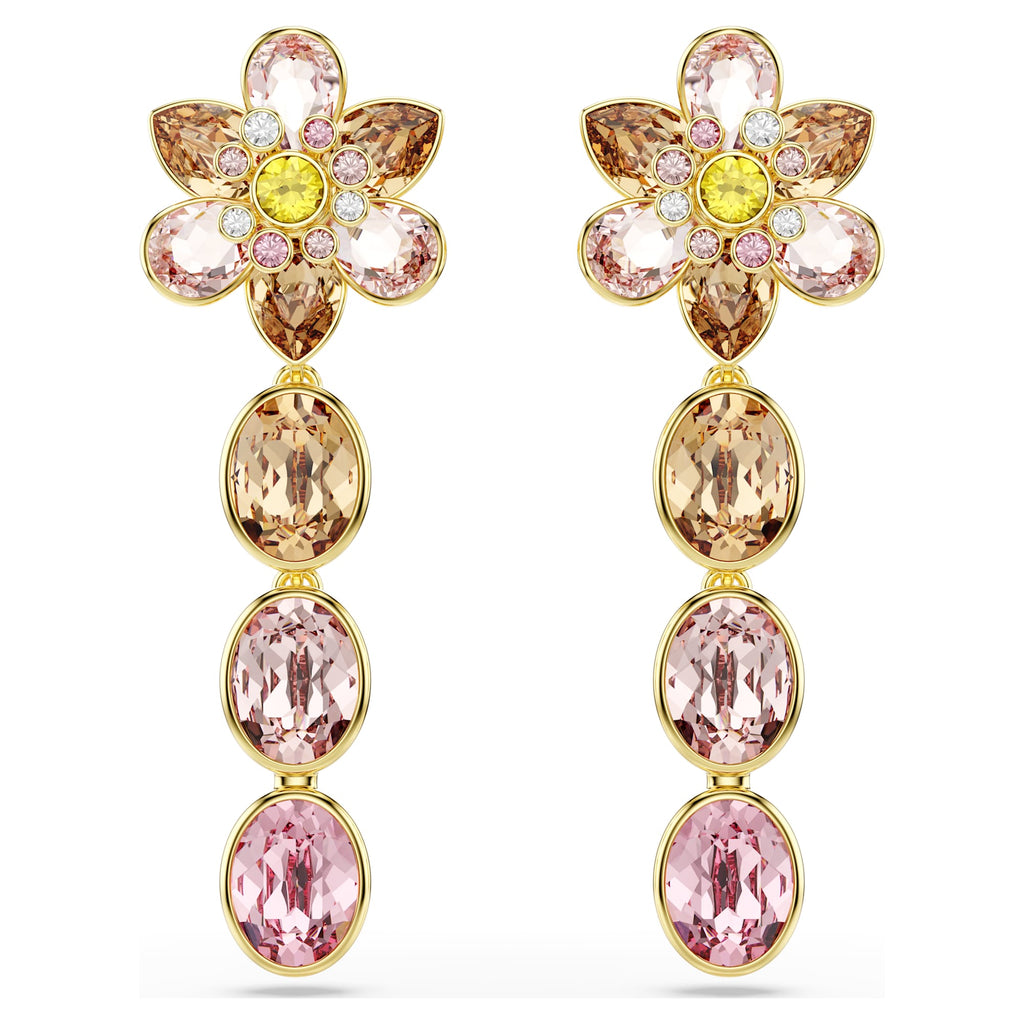 Idyllia drop earrings Asymmetrical design, Mixed cuts, Flower, Multicolored, Gold-tone plated