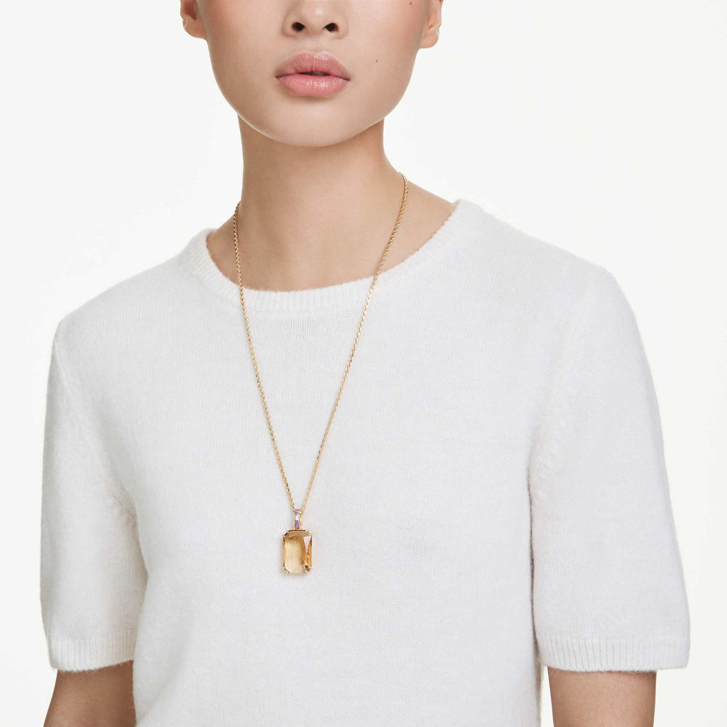 This glowing Millenia pendant is a creation of pure warmth and luxury. The central motif is crafted from a large caramel crystal in a double prong setting and connects to the gold-tone plated chain via an elegant bail adorned in channel-set purple crystals. Combine this pendant with a matching pair of earrings or a bangle to express an ultra-modern look.