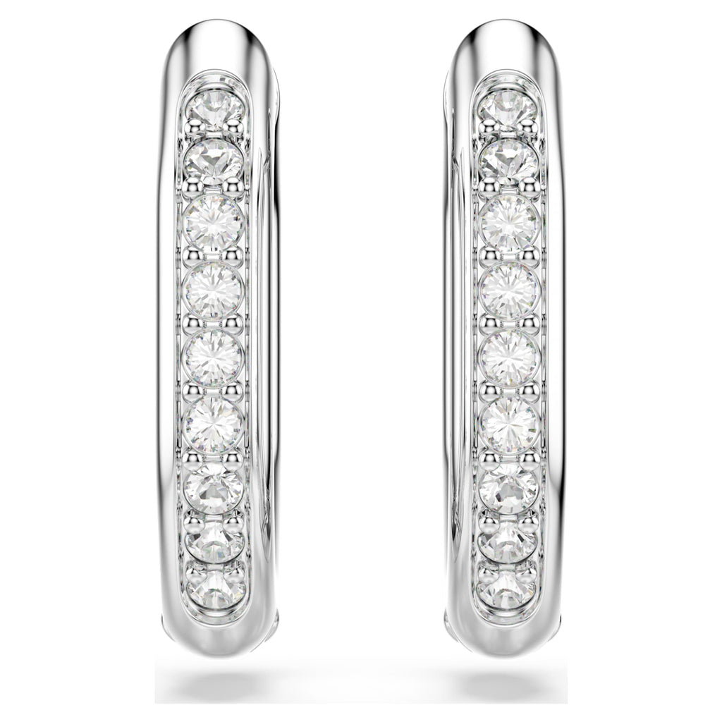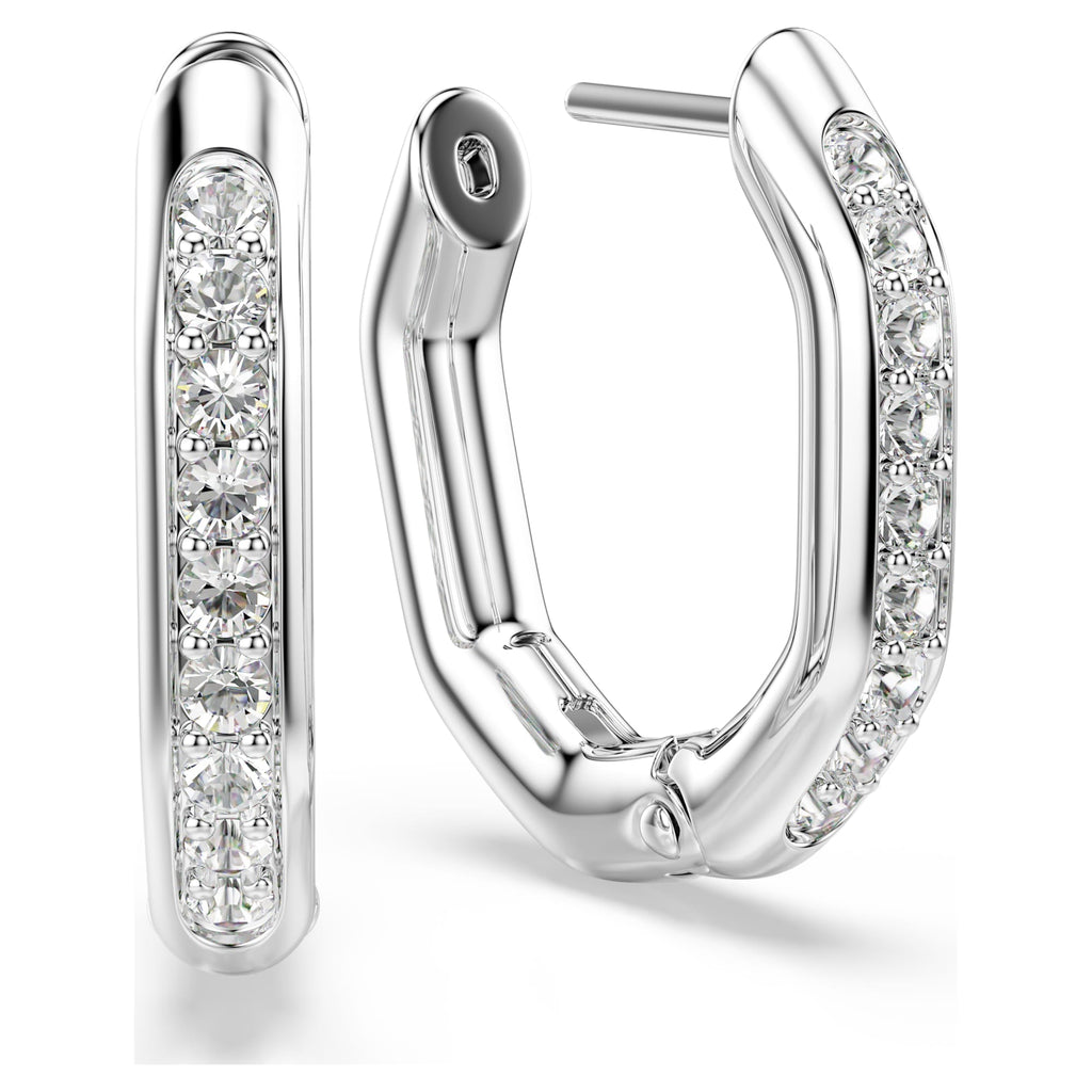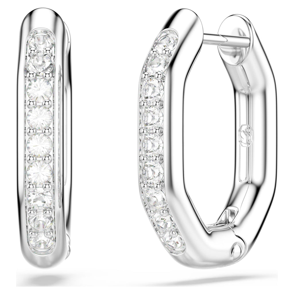 Make an expressive statement with these geometric hoop earrings. Their slender octagonal design creates a bold frame for the single row of clear round-cut crystals, which are each placed in a delicate prong setting. A special spring plate mechanism makes these earrings easy to open and close, while the rhodium plating is ready to mix and match with other Dextera pieces.