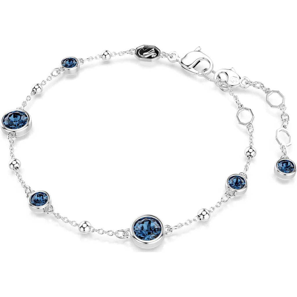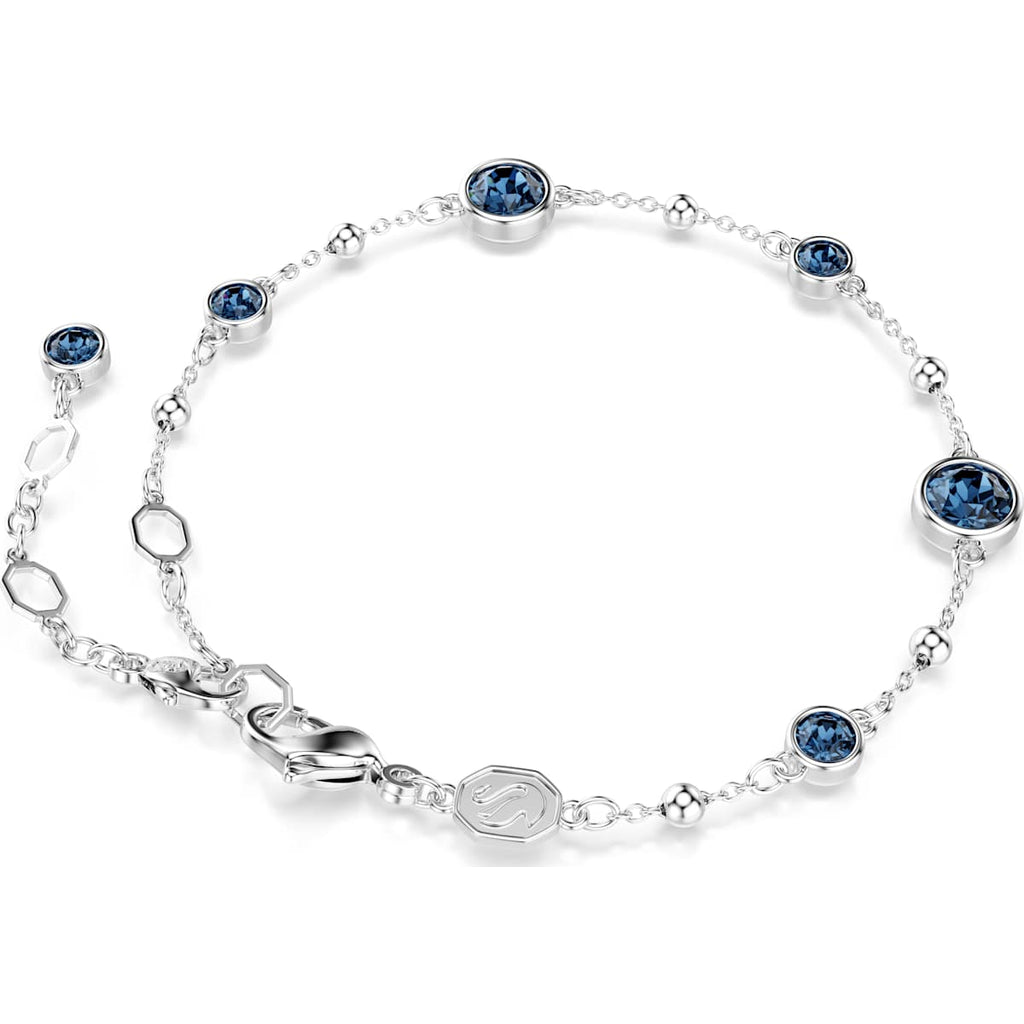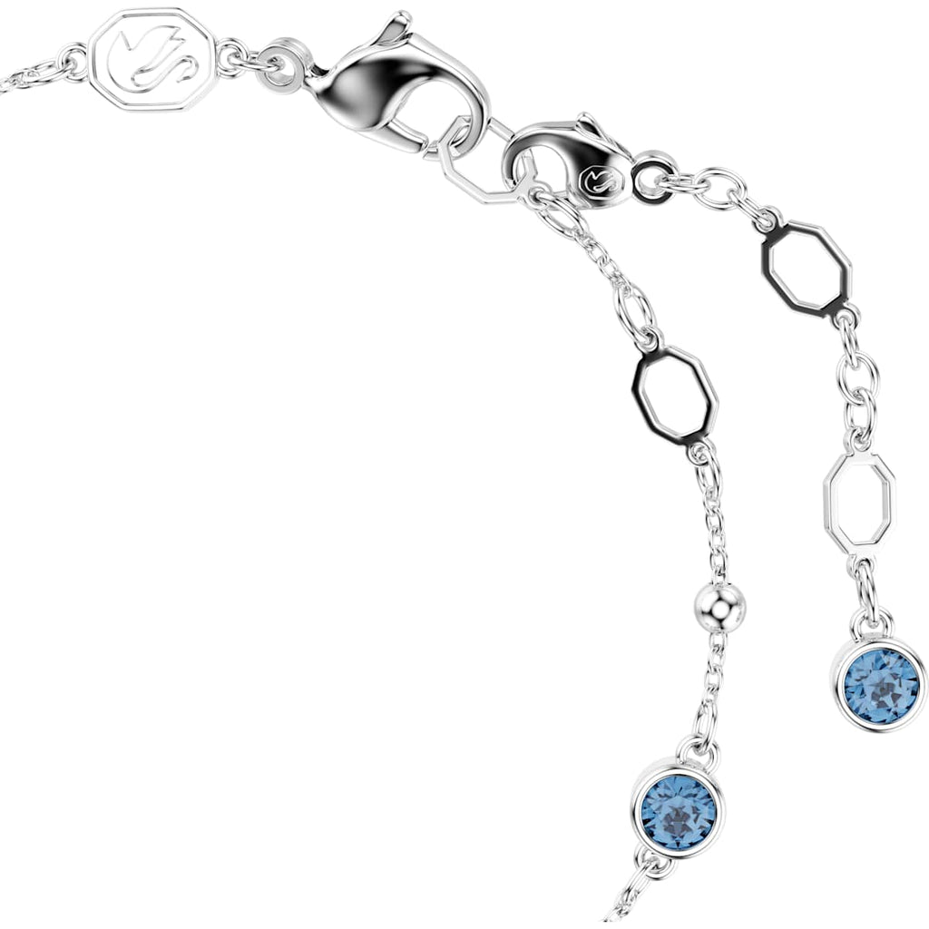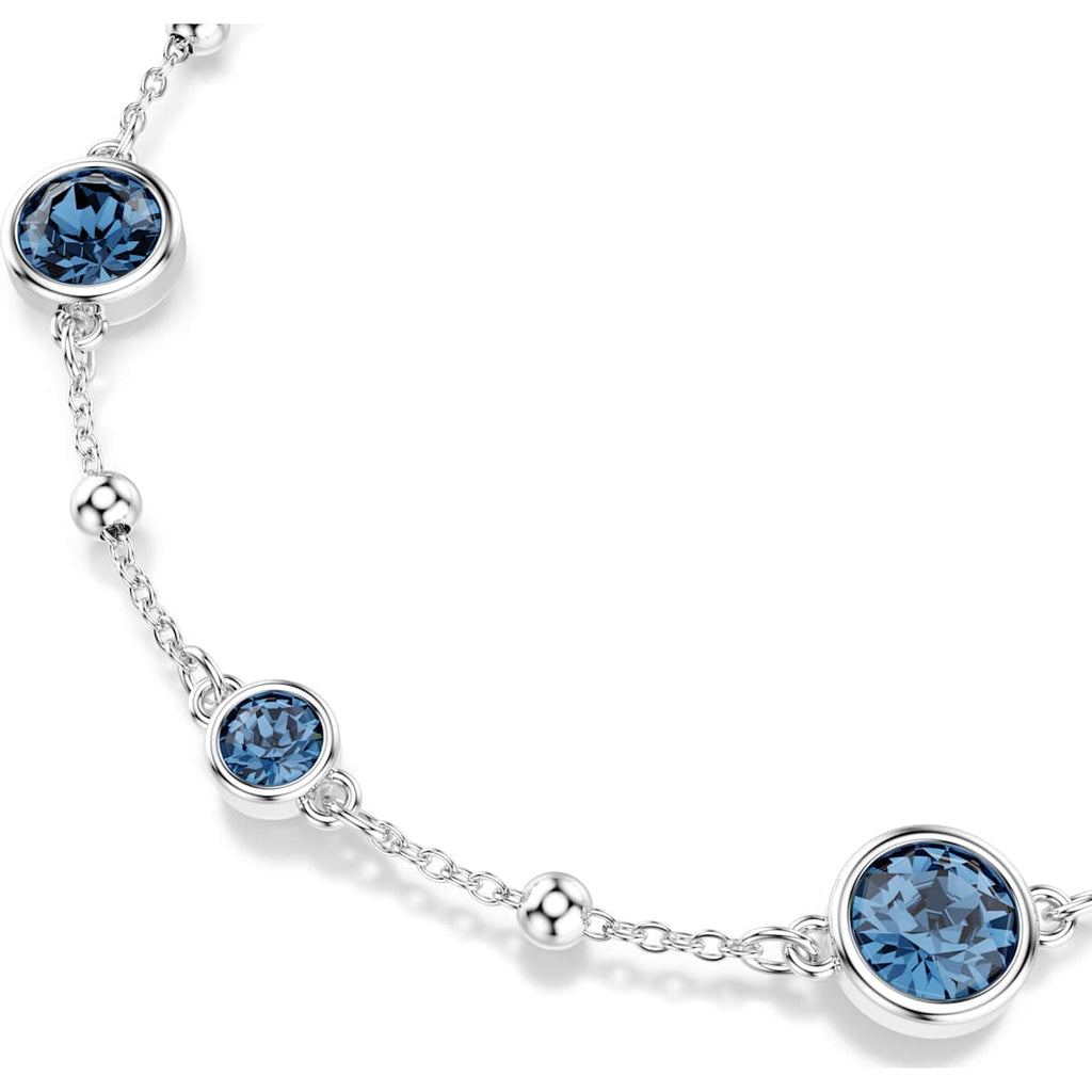With its dynamic mix of shapes, this Imber bracelet will give your wrist a distinctive glow. The rhodium plated chain features a lobster closure and a strand of metal droplets, interspersed with round blue crystals in a refined bezel setting. The piece also includes an extra elongation, allowing it to fit all sizes. Perfect for adding a soft and graceful touch to an outfit.