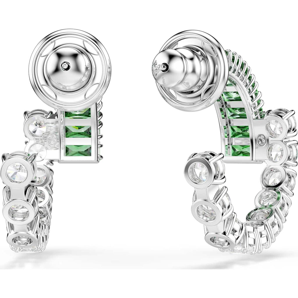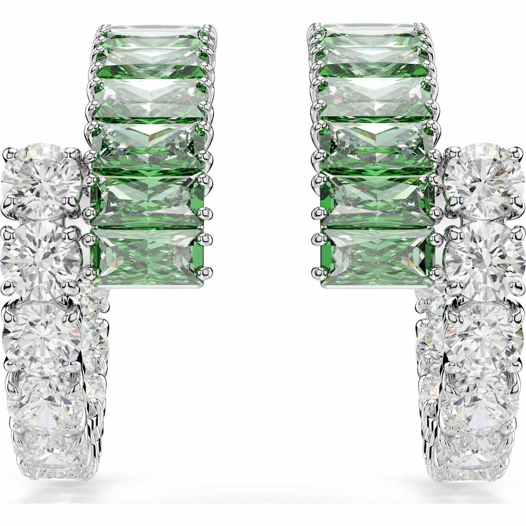 These luxurious Matrix earrings were crafted for a vivid glow. Each small hoop is rhodium plated and features an overlapping design set with clear and green Swarovski Zirconia in round and baguette cuts. A joyful choice for day-to-night styling, these earrings can be paired with a matching ring or bangle to accentuate the color in your style.
