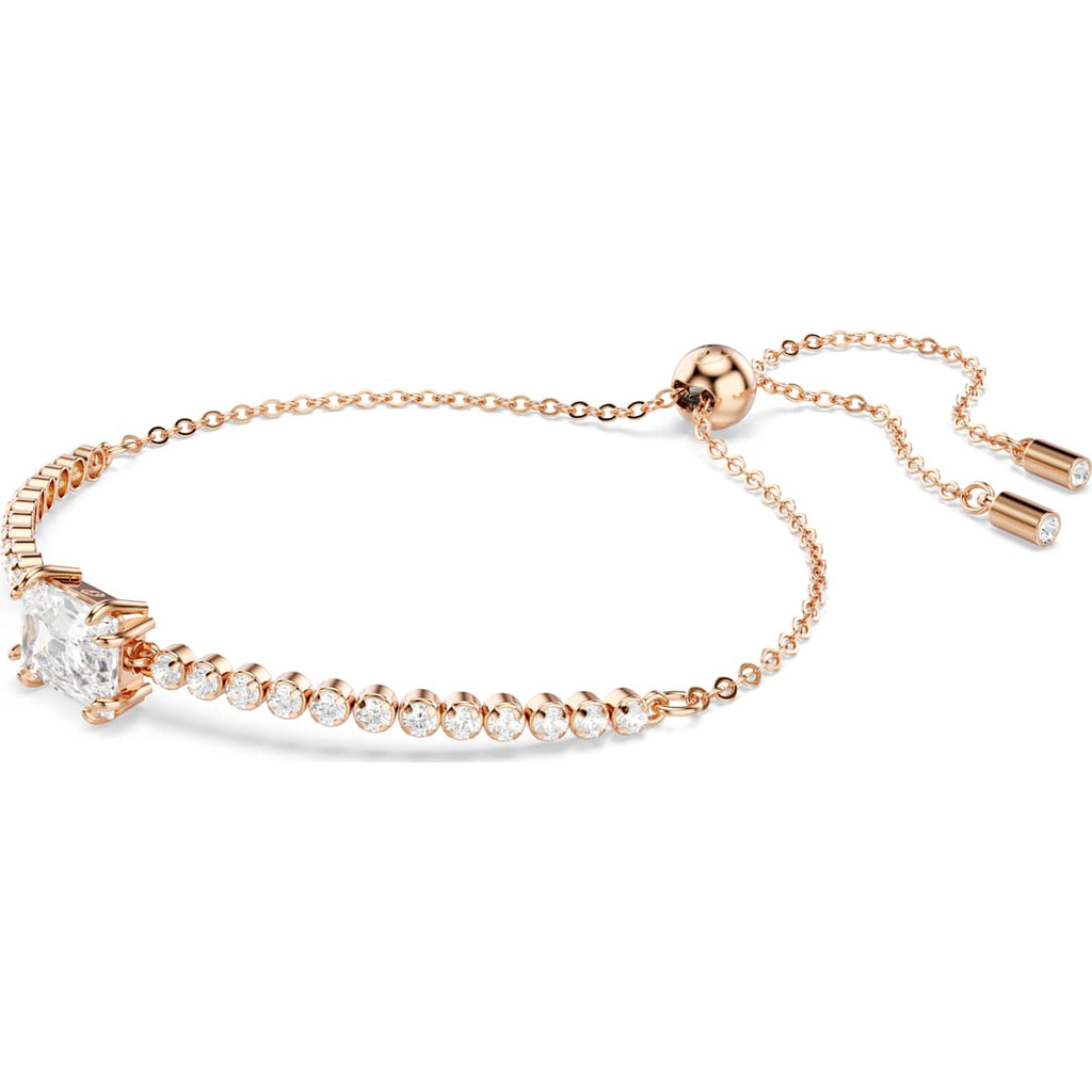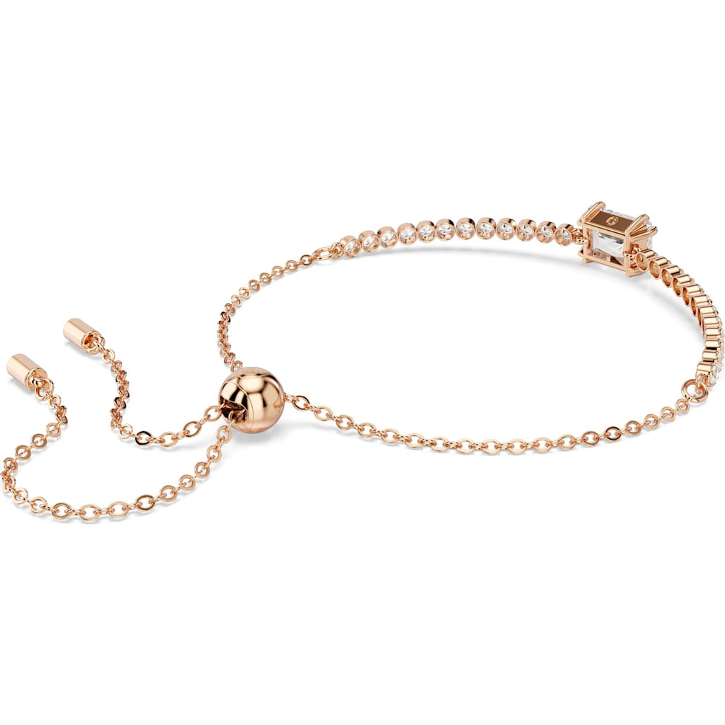This classic Tennis bracelets adds a touch of radiance to any look. Fastened with a sliding closure for an adjustable fit, the rose gold-tone plated design features a uniform row of Swarovski Zirconia and is accented with a baguette-cut Swarovski Zirconia at its center. A vibrant twist on a timeless style that you can wear time and time again.