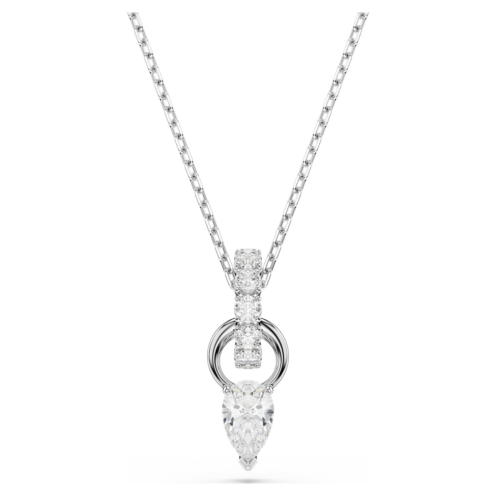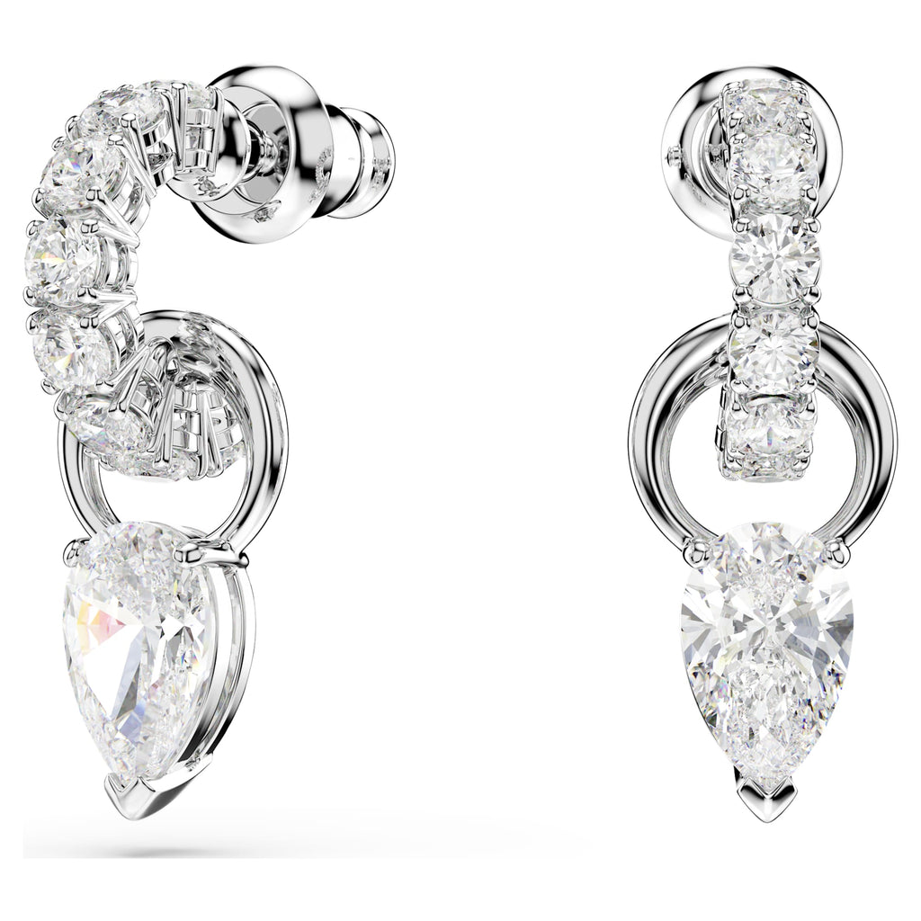 Give your style a coordinated look of radiance with this pendant and earrings set. Each shimmering motif features a pear-cut Swarovski Zirconia on a small hoop, which is connected to another rhodium plated hoop embellished with round-cut Swarovski Zirconia. On the pendant, a sliding mechanism on the chain allows for an easy length adjustment.