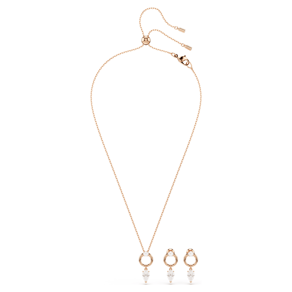 Give your style a coordinated look of warmth with this pendant and earrings set. Each glowing motif features a pear-cut Swarovski Zirconia, which is attached to a luxurious rose gold-tone plated hoop. An additional round-cut Swarovski Zirconia is also placed at the center of each piece, while on the pendant, a sliding mechanism on the chain allows for an easy length adjustment.