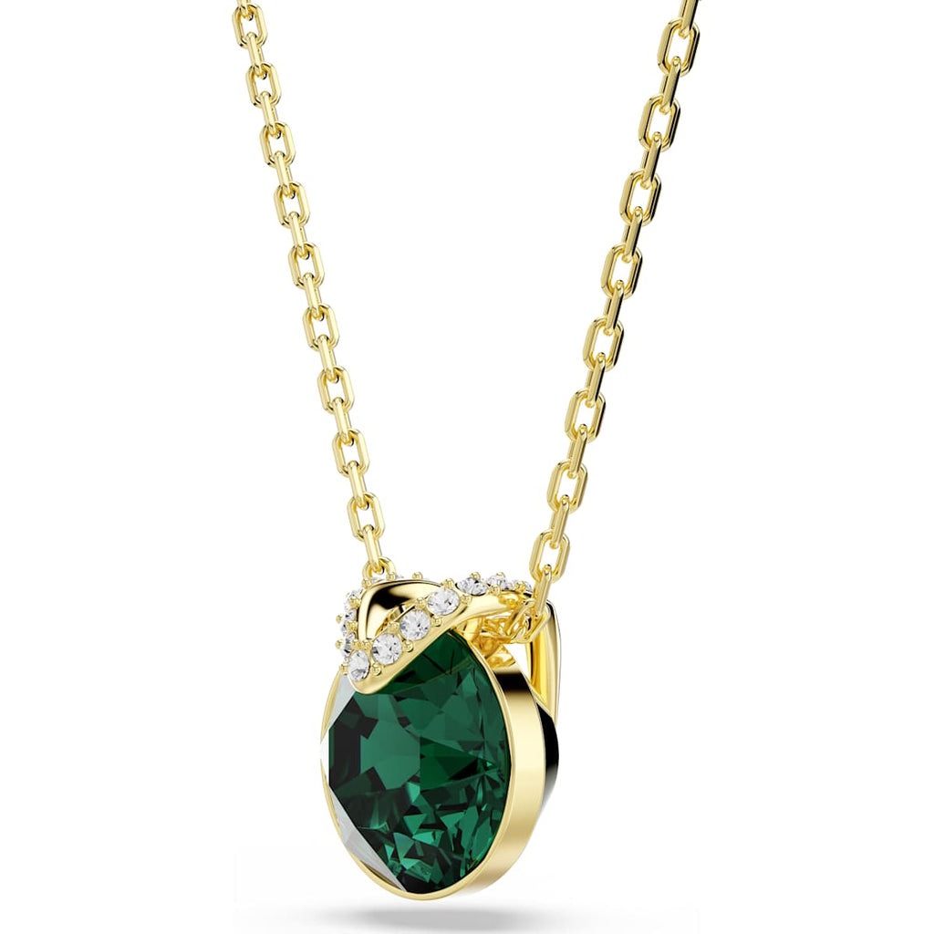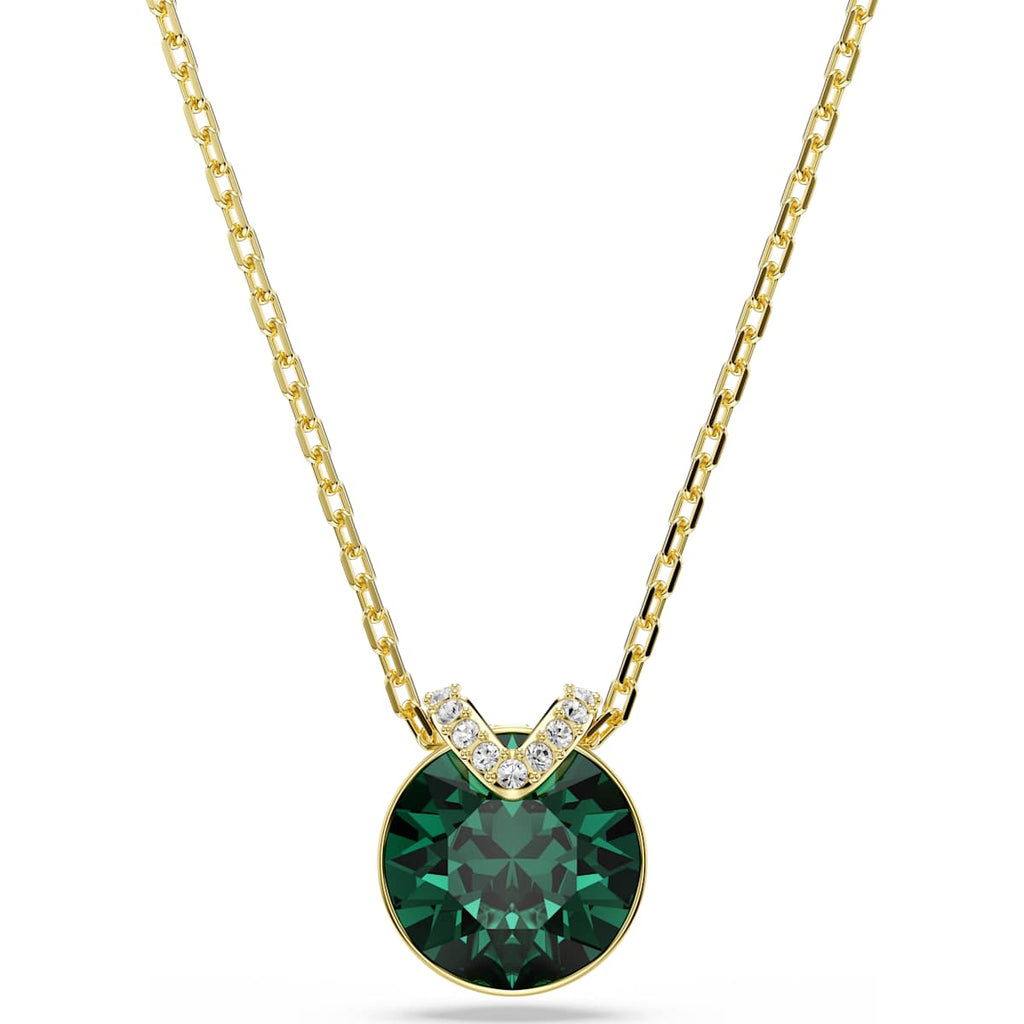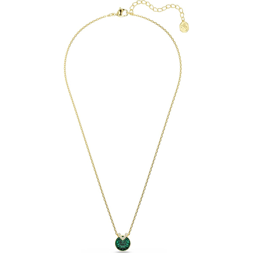 This mesmerizing V-shape pendant has eye-catching appeal thanks to its central green crystal set in gold-tone plating. A flourish of shimmering pavé adds an extra layer of beauty, while the delicate chain exudes pure elegance. Wear it together with the matching earrings for a wondrous combination.