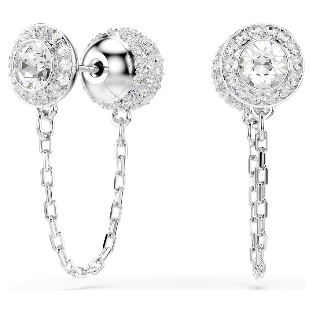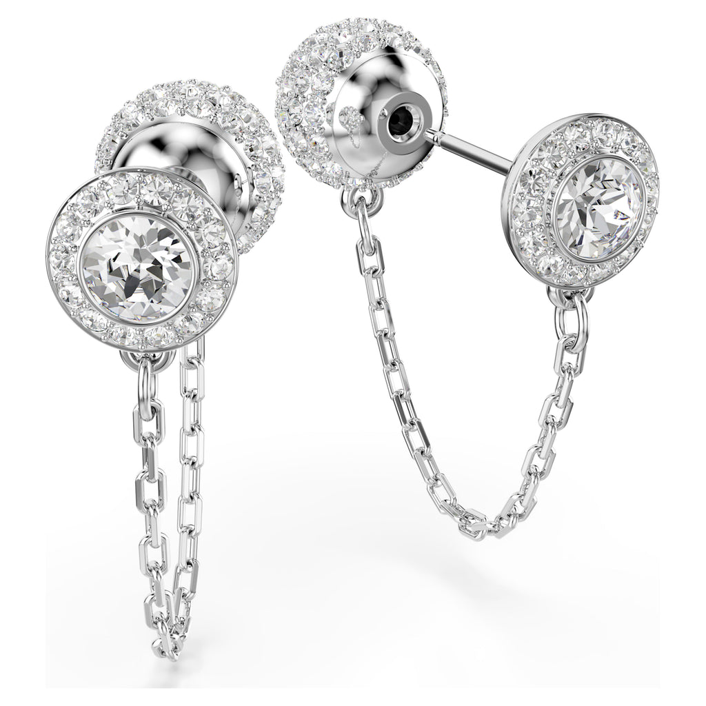 Radiate wonder with these shimmering Swarovski earrings. Each rhodium-plated piece features a long chain connected to a double-sided motif, offering a different display of round-cut crystals on each side. The hanging motif can also be connected to the back of the stud for a versatile wearing option. Mix and match with other Una Angelic pieces for a look of ultimate radiance.
